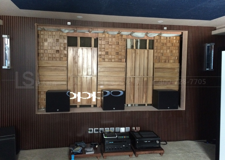 三只主音箱安装在幕布后面,幕布也是采用透声幕布。投影机吊装,四只环绕挂墙安装。墙壁的凹槽内暗藏灯带,美国杰士KS-525THX环绕音箱。看看幕布后面。我们都做了些什么---影院幕布的后面,我们放置了很多声学模块。