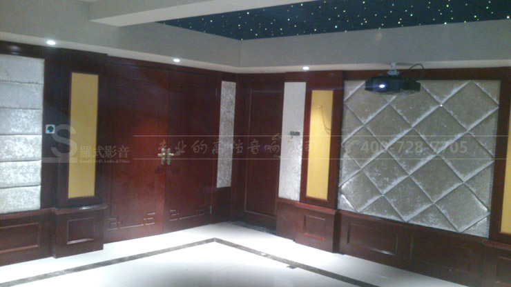 整个影院装修,框架结构采用的是木饰面装饰,其余部分采用软包和透声布装饰。整个影视厅用了近40个声学扩散体,主要有二次余数扩散体和六阶扩散体。主要分布在左右两侧墙,和前墙。后墙主要采用的是吸音处理。吸音层厚度达到5公分。整个系统,我们提前了安装时间,程先生迫不及待想先体验一把。你会发些,墙上的一些壁灯,开关都还没安装,我们在保洁之前就要求安装先体验下。